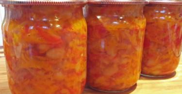 - Готовую овощную смесь разложить по стерилизованным любым способом банкам, хорошо утрамбовывая. Закупорить тару крышками, перевернуть вверх дном, укутать теплым пледом и оставить остывать в таком положении. После этого перенести закупорку в прохладное, защищенное от попадания прямых солнечных лучей место.
