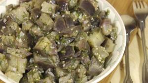 - Перед приготовлением обязательно вымочить сине-фиолетовые плоды в подсоленной воде несколько часов. Удалить плодоножку и нарезать кольцами толщиной не более 3 мм. Слегка поджарить на подсолнечном масле.