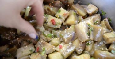 - Сине-фиолетовые плоды ополоснуть, удалить кожуру. Разрезать на кубики среднего размера. Выложить в емкость, обильно посыпав солью. Прикрыть крышкой, оставить на столе на 2 часа. Процедить через сито, овощ промыть, дождаться пока не стечет лишняя вода.