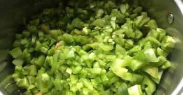 - В кипящую жидкость всыпать измельченный перец и горошины черного перца. Тушить овощи в течение 7 минут на медленном огне, плотно закрыв крышкой.